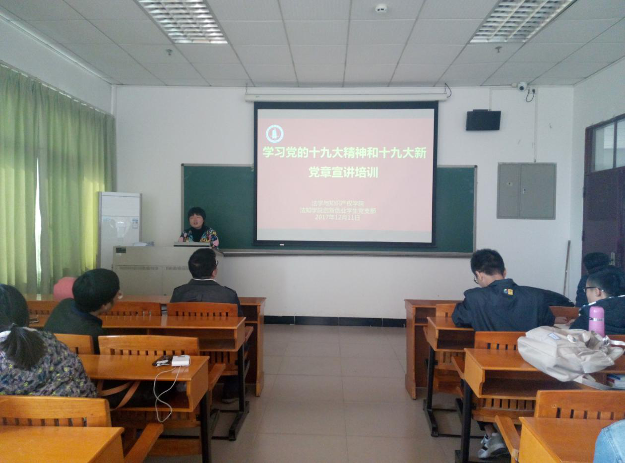 为了深入学习贯彻十九大精神,引导广大师生党员干部牢固树立“四个意识”,坚定“四个自信”,按照学校党委的工作部署和法知学院党总支的安排,12月11日,taptap点点体育组织学生创新创业党支部学生党员在一教427室进行学习十九大精神和十九大新党章宣讲培训会。会议由辅导员陈惠扬老师主持,学院党总支李雪斌副书记在会上就如何学习十九大报告,如何学习新党章进行了动员讲话和宣讲培训,辅导员白云飞老师、罗蓓老师列席了会议。