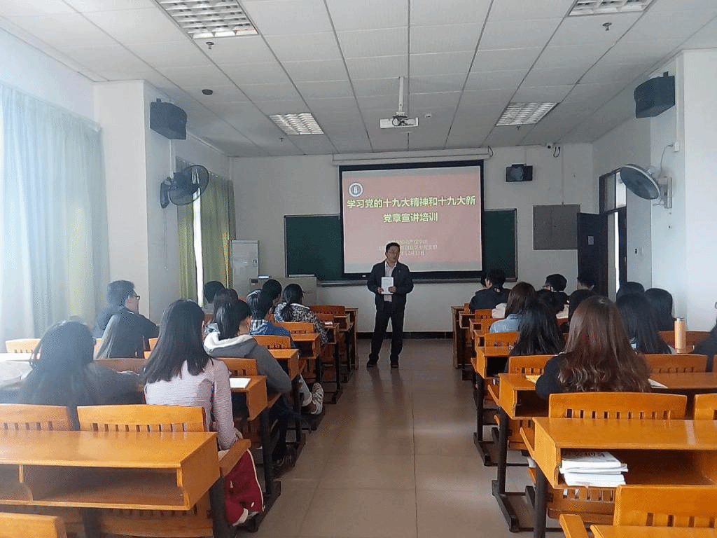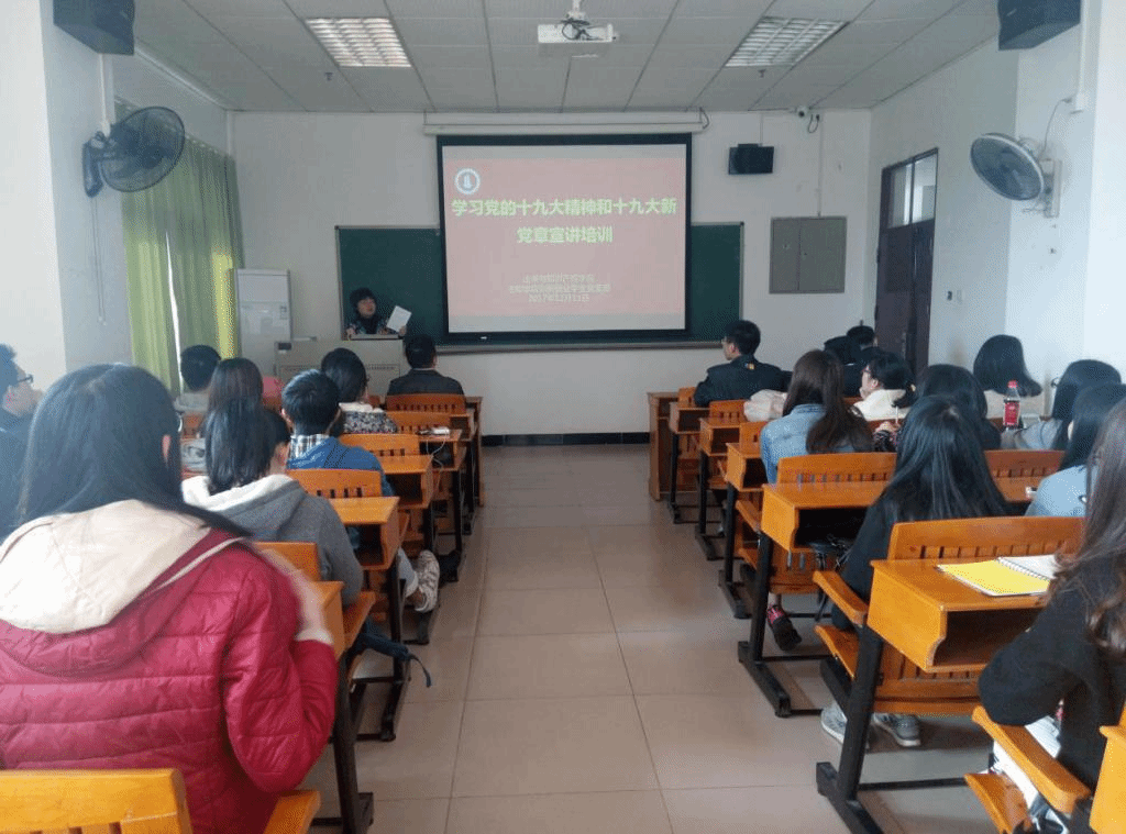 宣讲培训会用通俗易懂的语言对党的十九大精神进行了解读。通过“一图看懂十九大报告”、“关于依法治国的内容”、“关于教育的内容”、“关于社会保障体系的内容”、“对新青年的要求”以及“新党章诞生记”、“十大要点谱写新党章”等内容作了详细解读,为全体党员同志如何学好十九大报告和新党章以及下一步组织学生党员、入党积极分子定期进入学生宿舍宣讲党的十九大精神和十九大新党章工作打下坚实基础。