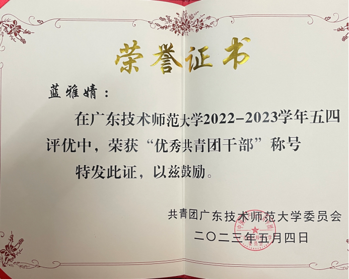 经过层层申报选拔,taptap点点体育团委获评五四红旗团委、20法学6班团支部获评五四红旗团支部标兵;20法学2班、21法学1班、22法学7班获评优秀共青团支部;团委副书记蓝雅婧获评优秀共青团干部;陈慧婷、黄讯、陈依依、王欣怡同学获评优秀共青团员。
