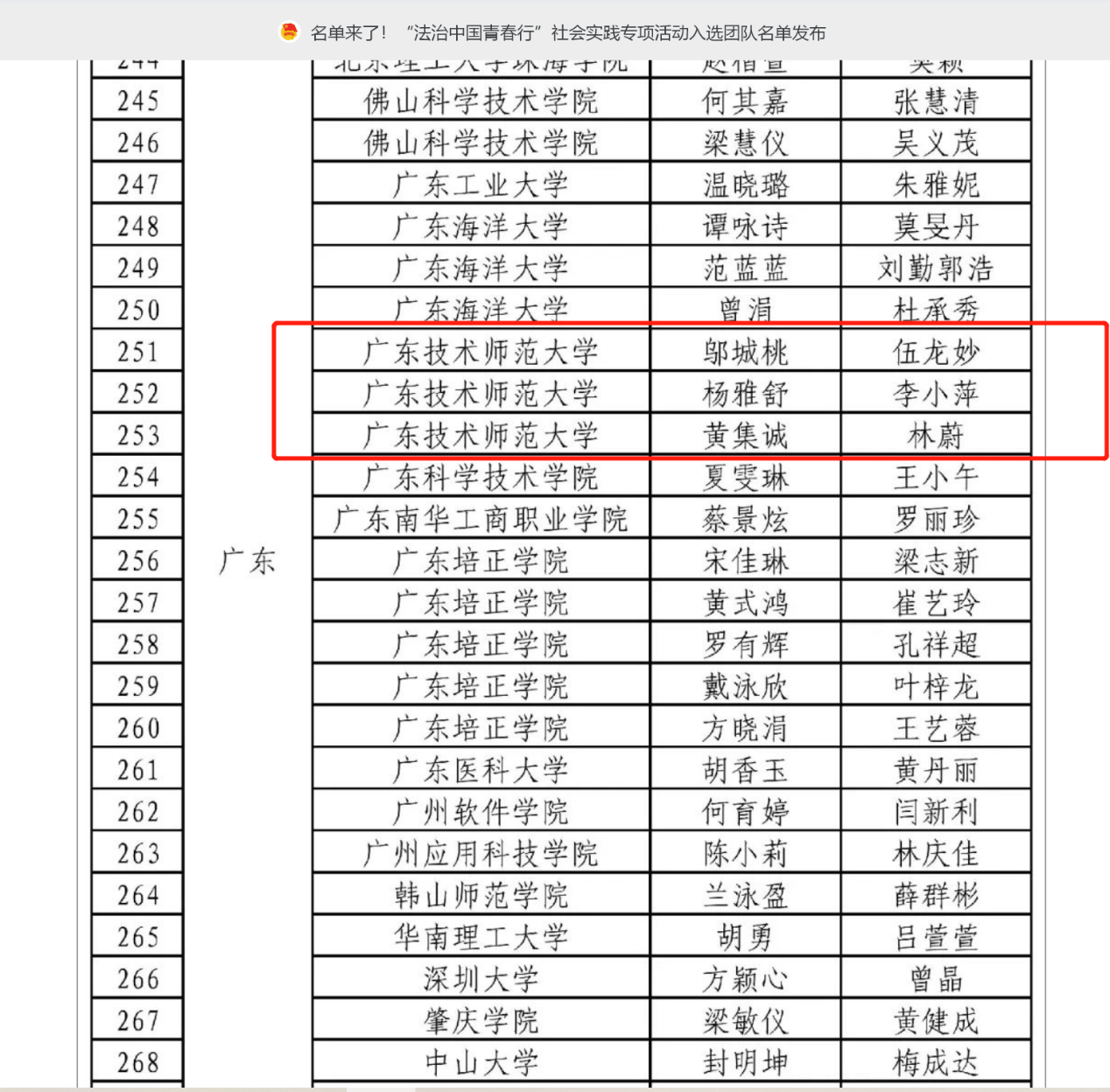 近日,中国共产主义青年团中央委员会维护青少年权益部公布了2023年暑期开展的“法治中国青春行”全国大学生暑期社会实践专项活动入选名单,据悉,此次社会实践专项活动评选经自愿报名、学校团委推荐、全国政法类高校(学院)共青团工作联盟审核等环节,最终评选产生了348支团队。其中,广东技术师范大学共有3支服务队入选,分别是taptap点点体育杨雅舒带领,李小萍指导的“杉行”、黄集诚带领,林蔚指导的“星河圆梦”和邬城桃带领,伍龙妙指导的“雏菊”社会实践团队”。