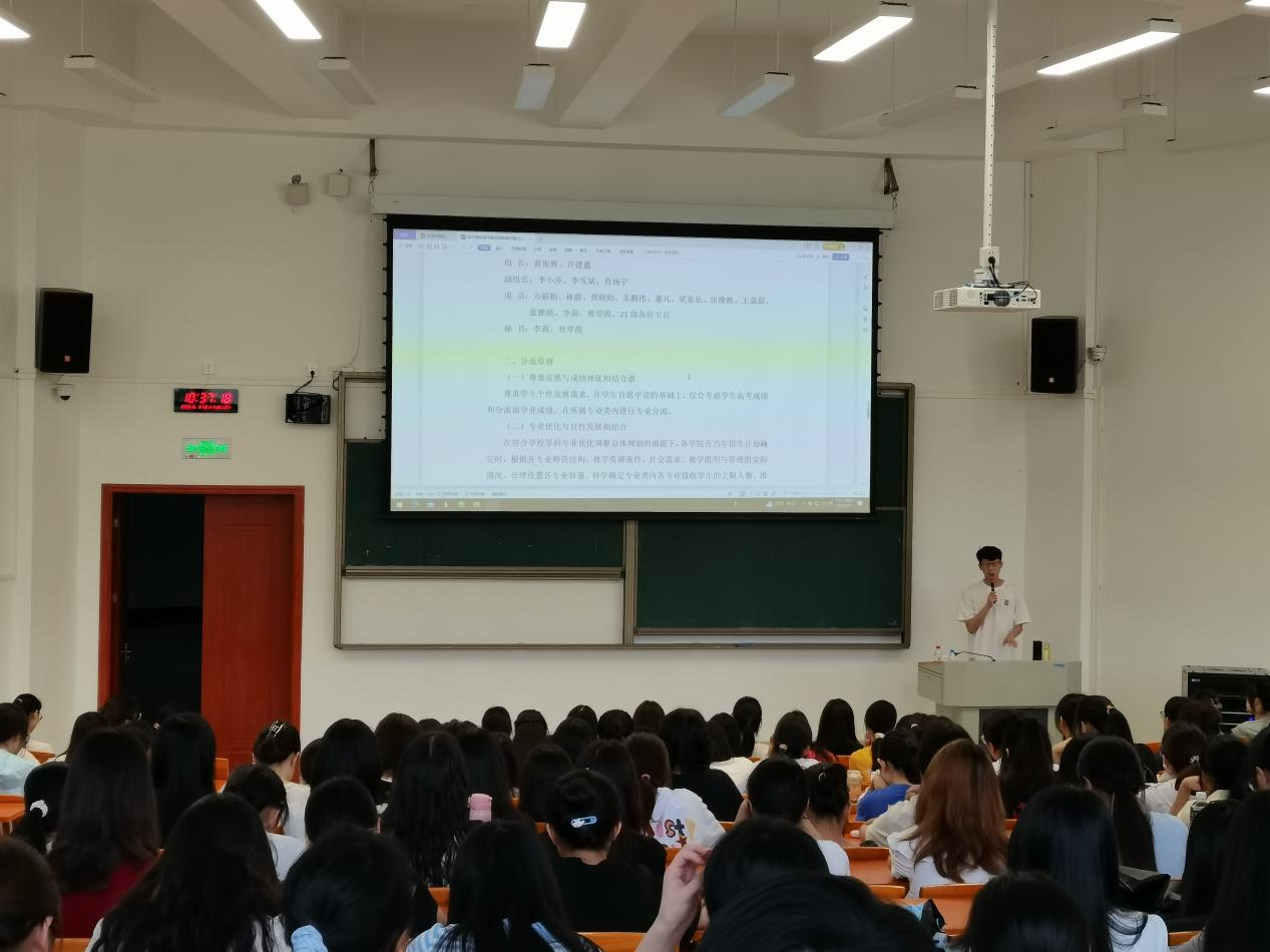 为进一步做好taptap点点体育大类招生专业分流工作,taptap点点体育于6月9日上午在河源校区大讲堂102、206室召开“法学大类招生专业分流实施方案宣讲会”。专业负责人曾晓昀老师和董凡老师、辅导员王嘉晨和蓝雅婧老师以及2022级全体同学出席本次专业分流宣讲会。