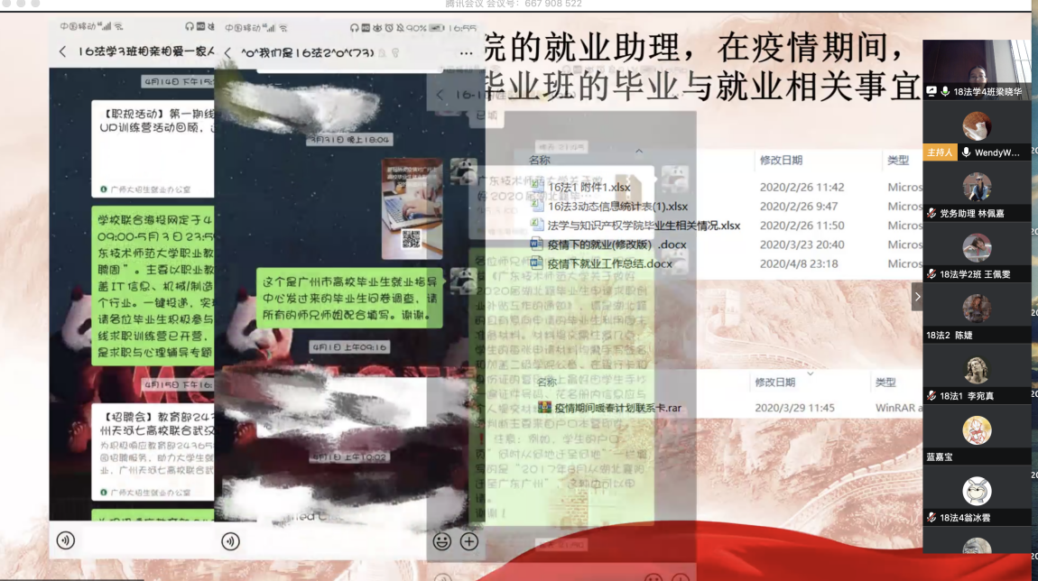 18法学4班梁晓华同学作为学院两届就业助理,在疫情期间,毕业生无法返校的情况下,她依然坚守岗位,通过线上形式给毕业班的师兄师姐们发布招聘信息、收集办理就业所需重要材料等工作。