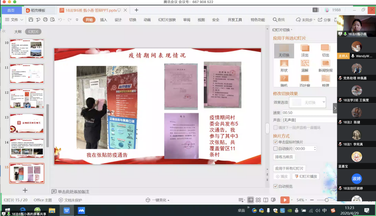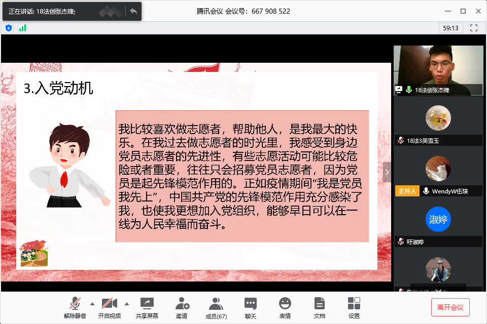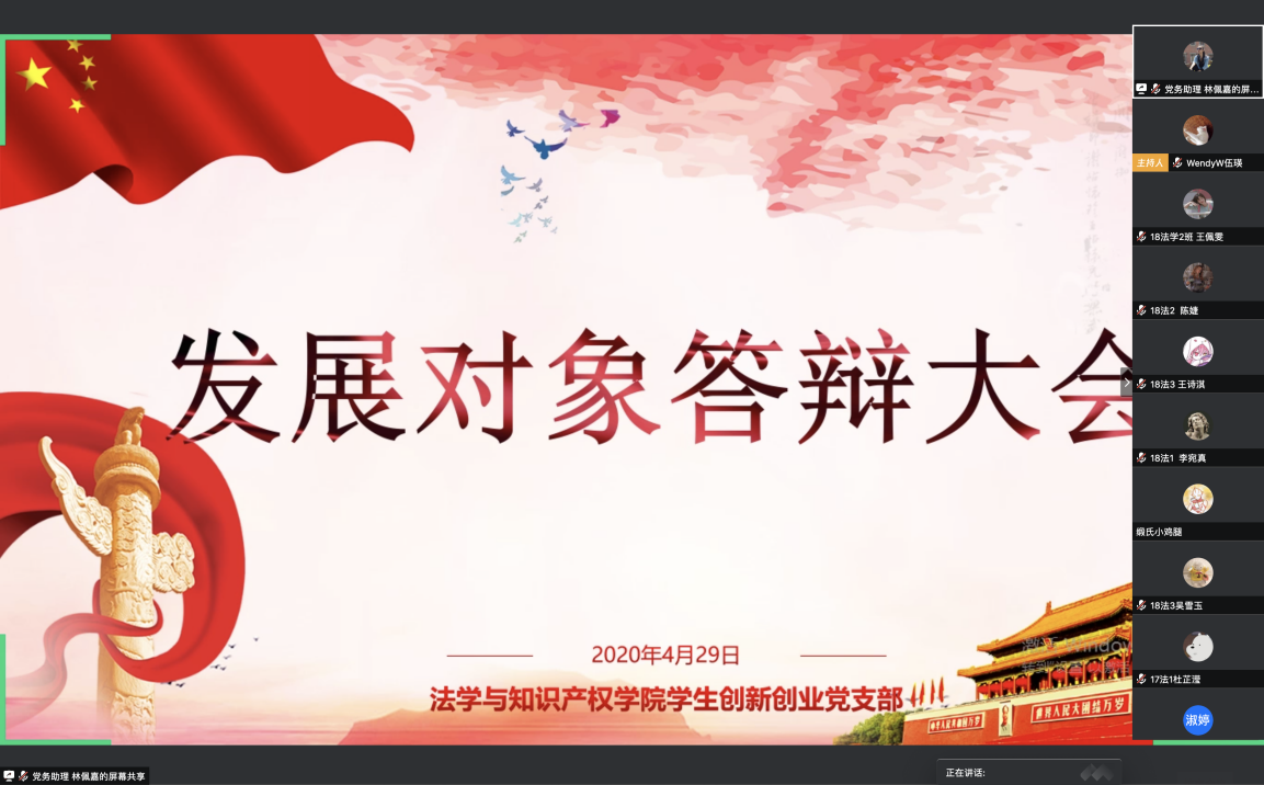 疫情影响了线下答辩的机会,但绝不影响同学们们积极向党组织靠拢的决心。同时疫情的考验,也检验并激励着同学们的初心和使命,用行动阐释着我党为人民服务的宗旨。如:18法学6班的甄小燕同学就与大家分享了在疫情期间,她积极响应家乡的号召,投身于疫情防控工作中,尽己所能服务家乡和群众,在答辩会上她就与大家一起分享了自己在家乡帮助村委会粘贴告示的志愿事迹。