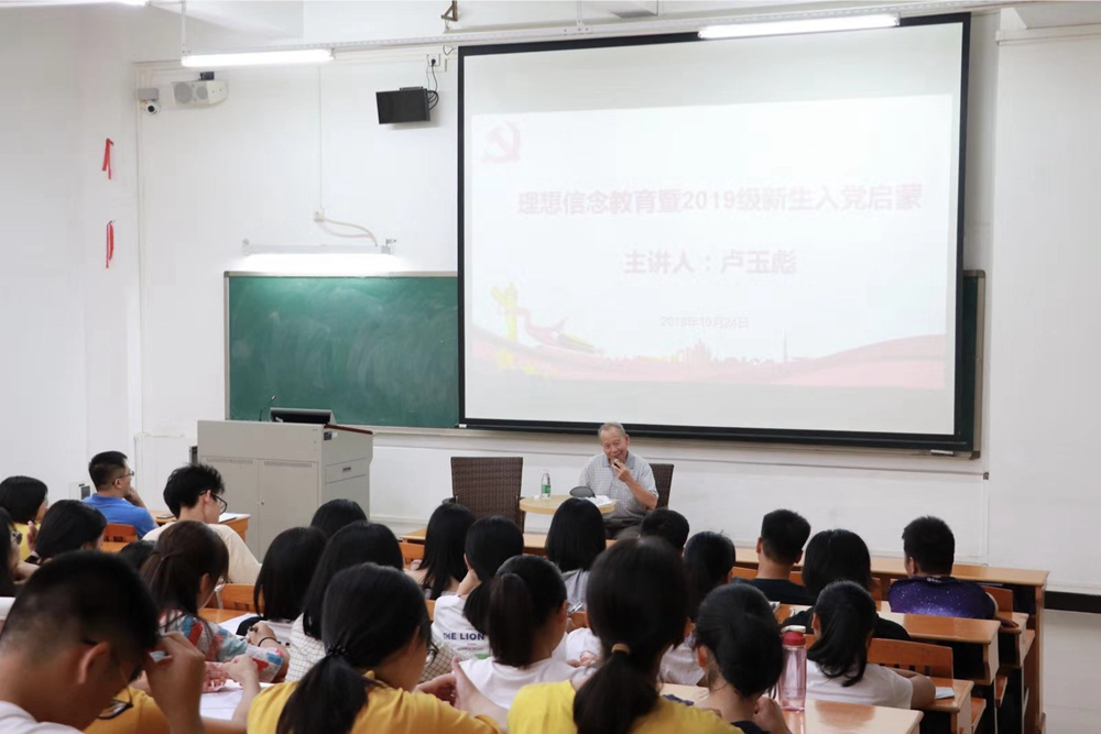 为扎实开展“不忘初心、牢记使命”主题教育,引导2019级学生进一步了解党的历史,加深对党的认识,端正入党动机,坚定共产主义理想信念,10月24日,taptap点点体育,taptap点点官网入口院在白云校区三教107举办“理想信念教育暨2019级新生入党启蒙”专题讲座,学校关工委委员卢玉彪老师应邀作专题报告,学院党总支书记许建鑫、副书记李雪斌,辅导员伍瑛参加会议。李雪斌主持会议。