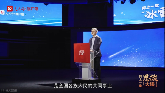 本次思政大课由北京体育大学党委书记曹卫东教授、中国农业大学马克思主义学院院长张晖教授、清华大学美术学院党委书记马赛教授主讲,分别讲授了“冬奥之路”“理论指导”“使命在肩”“奋斗有我”等内容,从不同的角度、不同的层面诠释我国体育一路披荆斩棘取得的伟大历史成就、铸就的冬奥精神和对新时代广大青年的殷切期望。