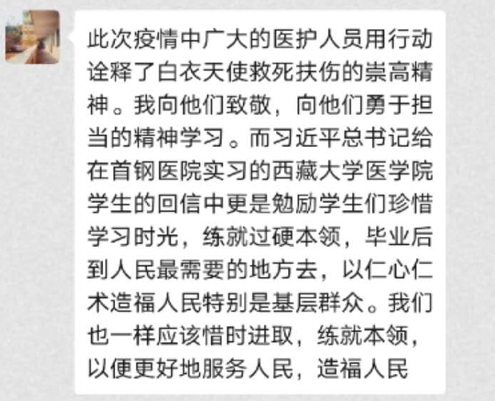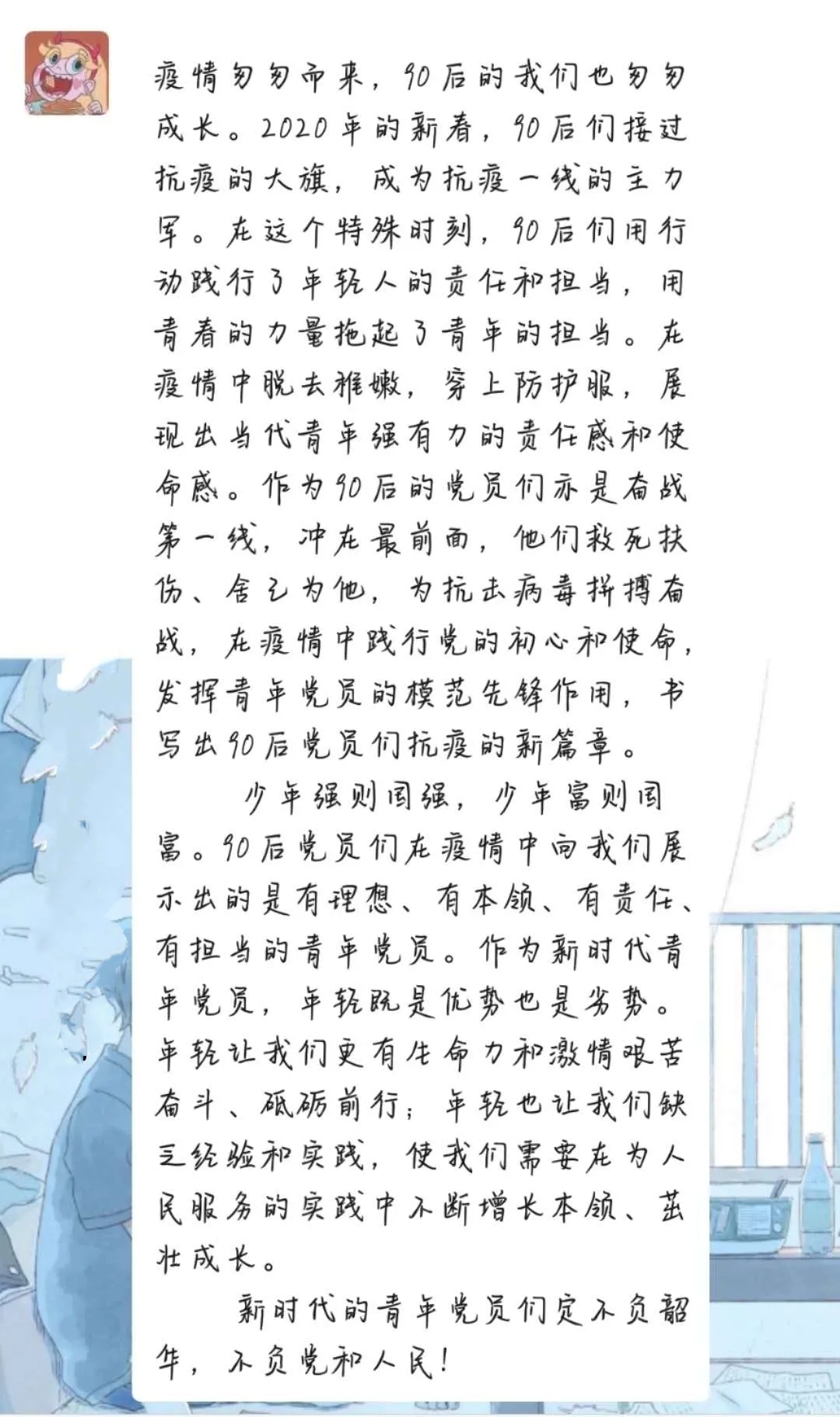 3月15日,习近平总书记给北京大学援鄂医疗队全体“90后”党员回信,向他们和奋斗在疫情防控各条战线上的广大青年致以诚挚的问候。taptap点点体育,taptap点点官网入口院学生创新创业党支部第一时间组织发动党员青年以自主学习+线上交流的方式开展以“读习近平总书记勉励“90后”党员的回信有感”为主题的专题学习,引领党员青年开展学习。以下为党支部的精选心得,跟着小编去看看各个党员的深刻感悟吧~