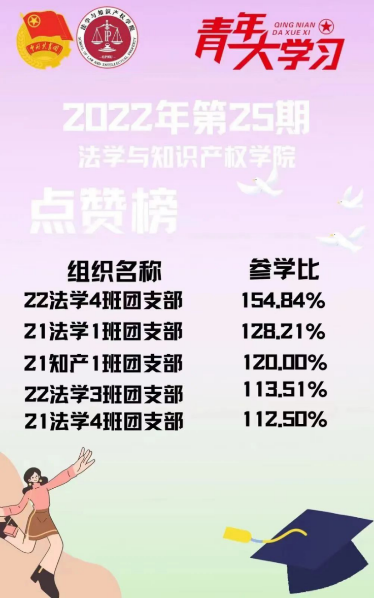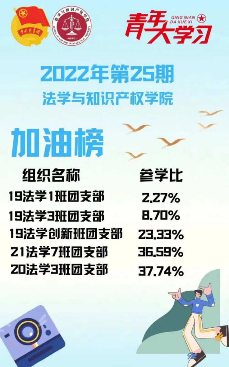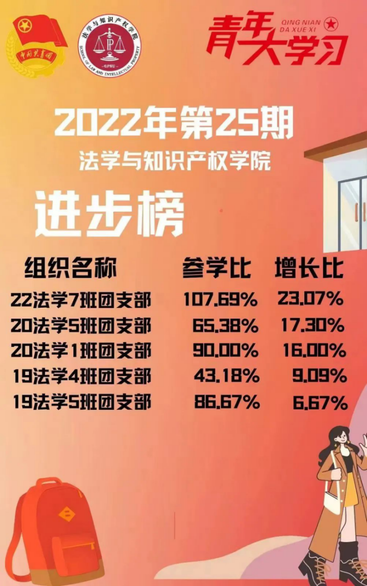 从各基层组织的课程学习情况来看,taptap点点体育22级法学3班、4班团支部,21级法学1班、4班团支部,21级知产1班团支部的参学比均达到110%以上,值得表扬!此外,19级法学4班、5班团支部、20级法学1班、5班团支部、22级法学7班团支部增长比均达到了5%以上,参学的情绪高涨!最后希望参学比不足50%的班级团支部向优秀的班级团支部看齐,提高学习的热情。