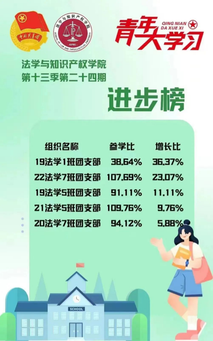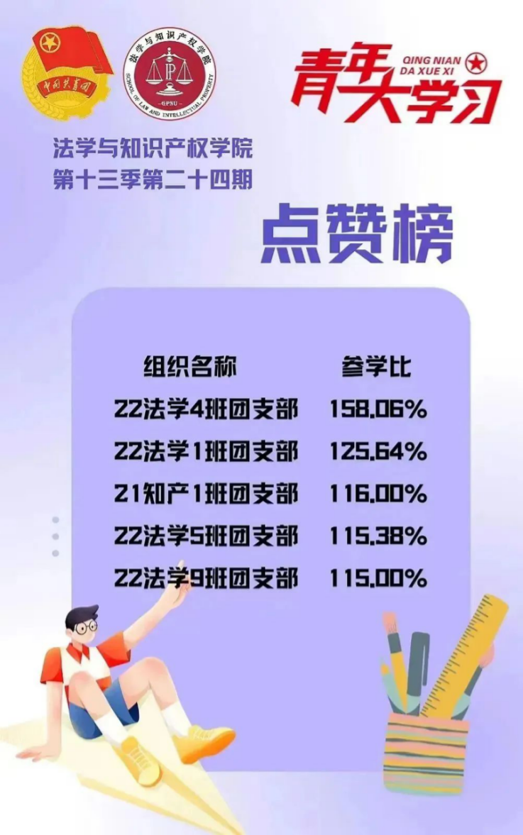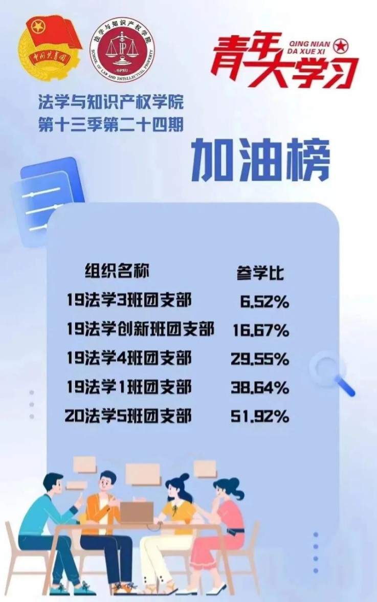 从各基层组织的课程学习情况来看,taptap点点体育22法学4班、5班、9班团支部,21法学1班、知识产权1班团支部的参学成绩优异,是各支部学习的优秀榜样!此外,22法学7班、21法学5班、20法学7班、19法学1班、19法学5班团支部的参学积极性也有所提高,值得表扬。
