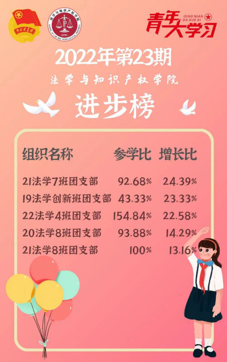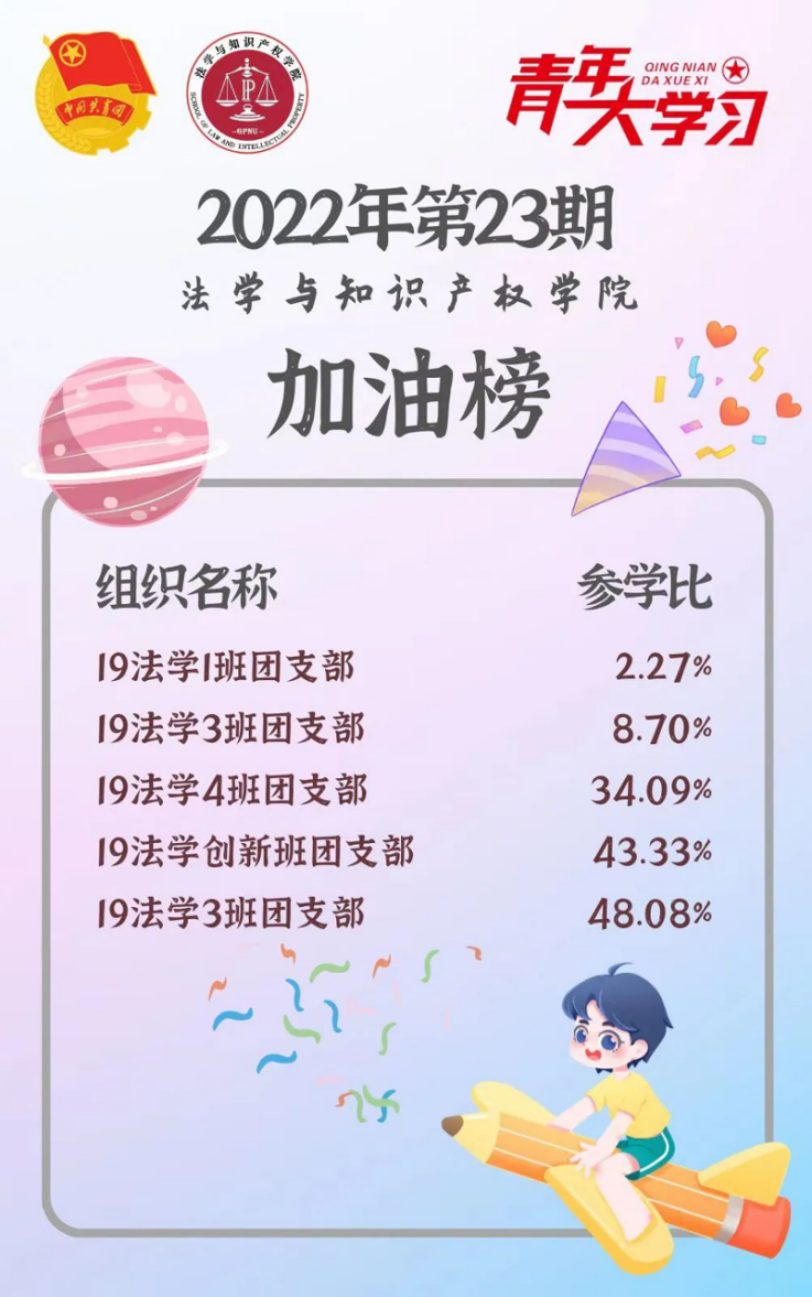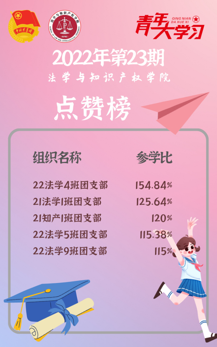 从各基层组织的课程学习情况来看,taptap点点体育22级法学4班、5班、9班团支部、21级法学1班团支部和21级知产1班团支部的参学比均达到110%及以上,希望下期再接再厉!此外,22级法学4班团支部、21级法学7班、8班团支部、20级法学8班团支部和19级法学创新班团支部的参学增长比有所提高,参学情绪上涨,值得表扬!最后希望参学比不足50%的班级团支部在下一期有新的提高和突破。