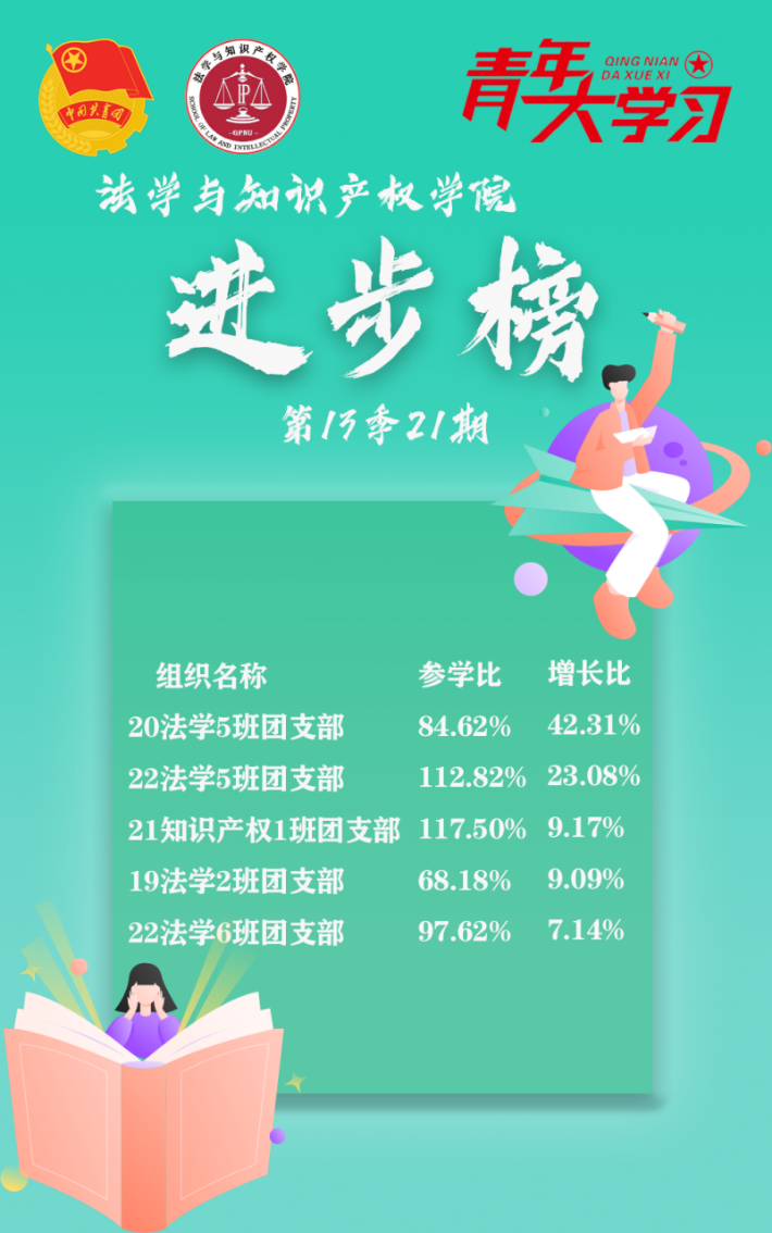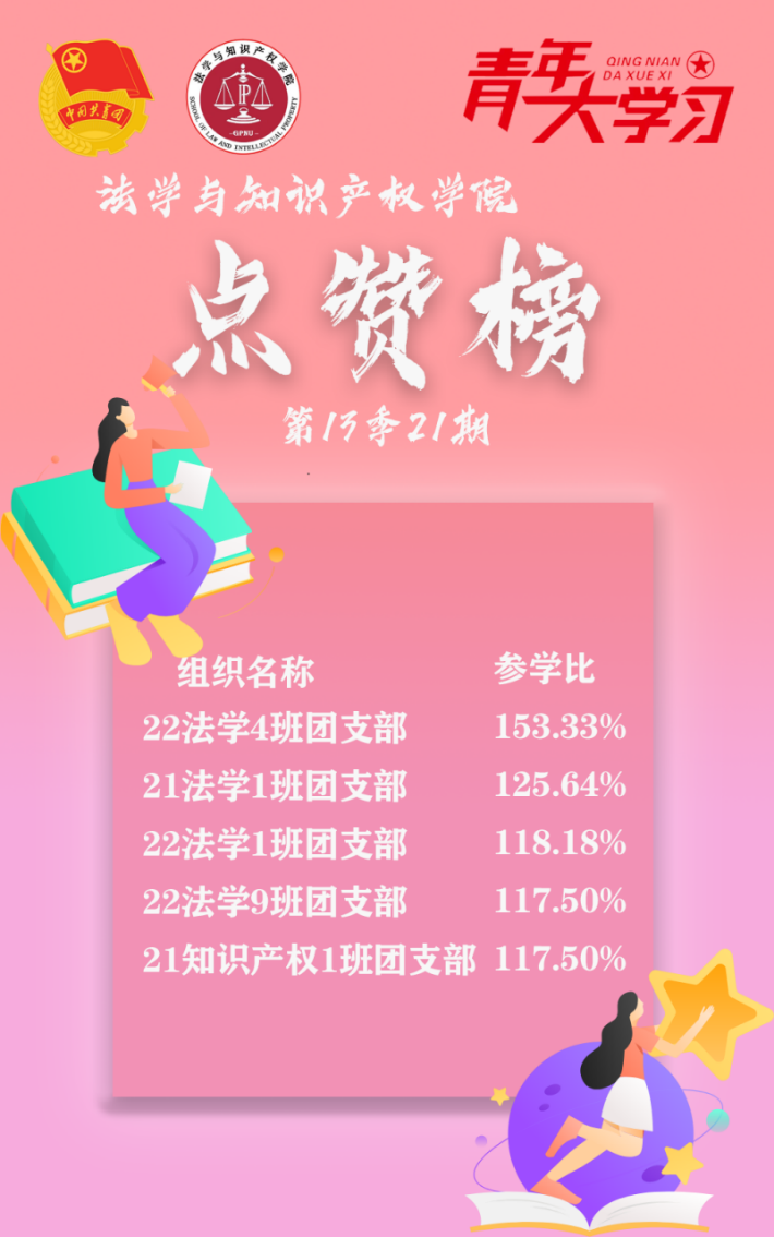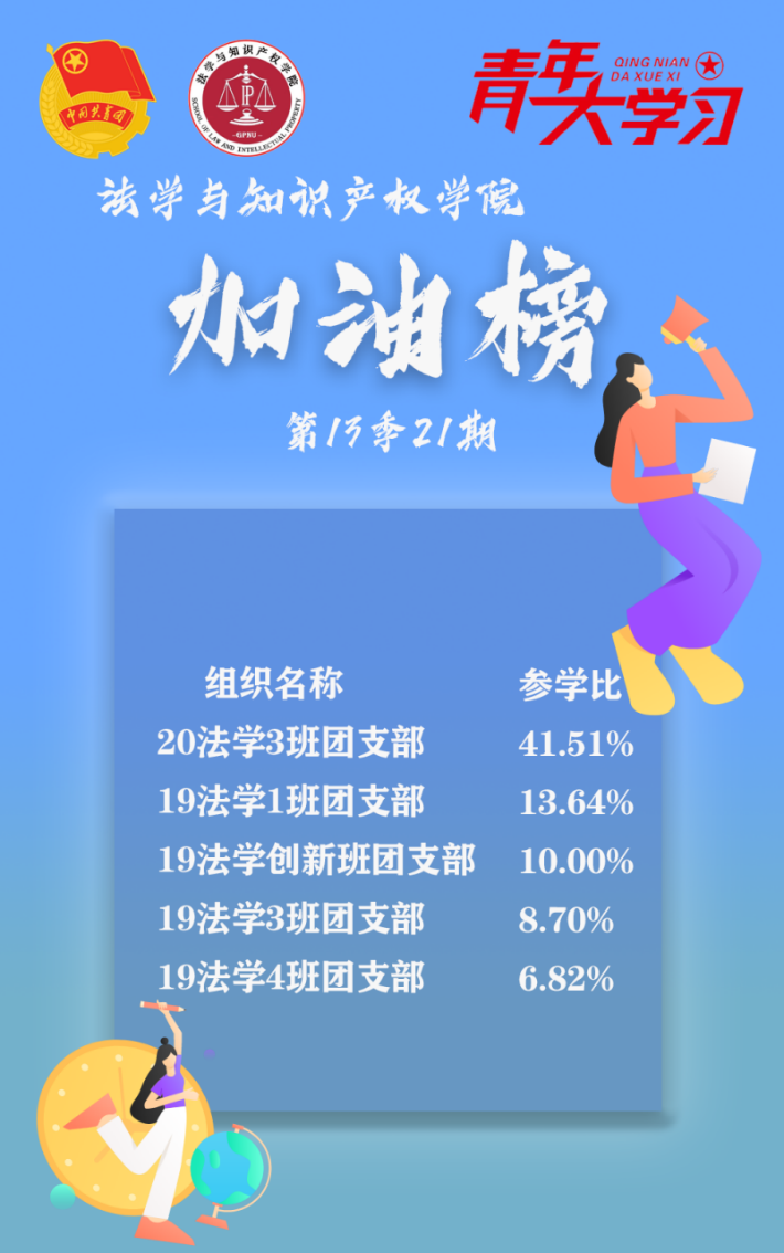 新一季第二十一期的“青年大学习”课程学习已经开始,法知学院各团基层组织积极发动团员进行学习。以下是taptap点点体育本周“青年大学习”各班级团支部参学率情况: