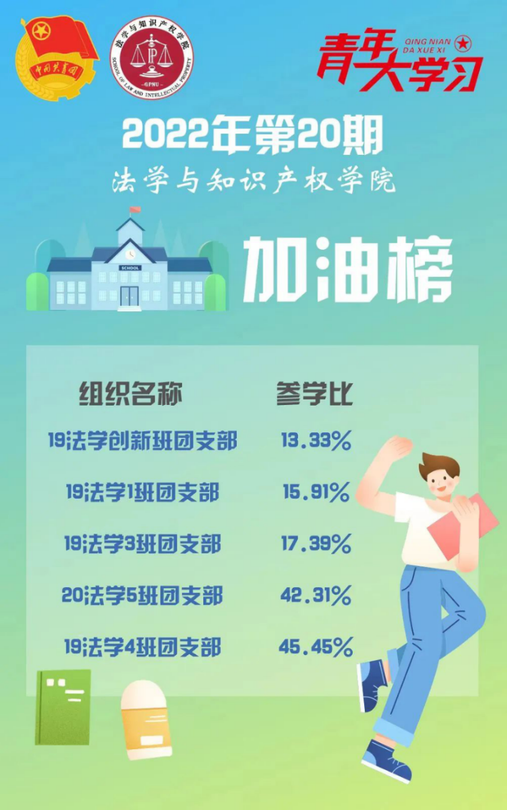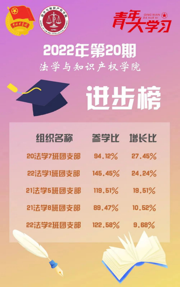 同时,20法学7班、22法学1班团支部参学率增长超过20%,学习积极性有所提高,值得表扬。