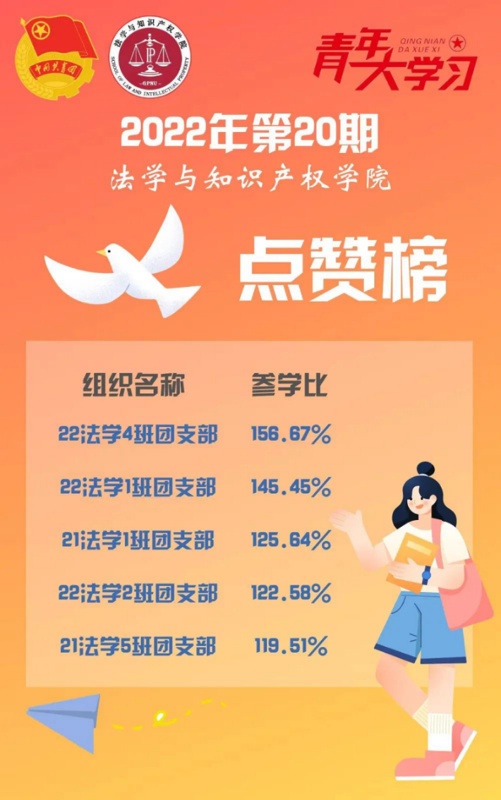 从各基层组织本周的课程学习情况来看,taptap点点体育22级法学1班、2班、4班团支部,21级法学1班、5班团支部的参学情况优异,是各团支部优秀的学习榜样!