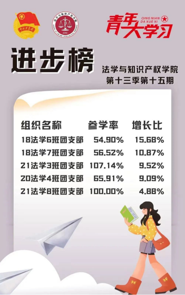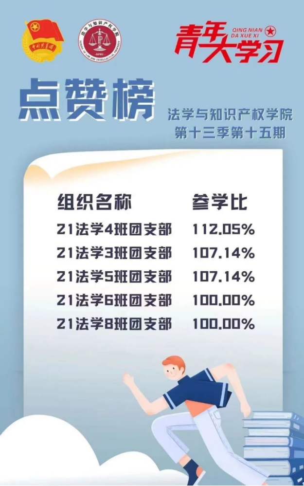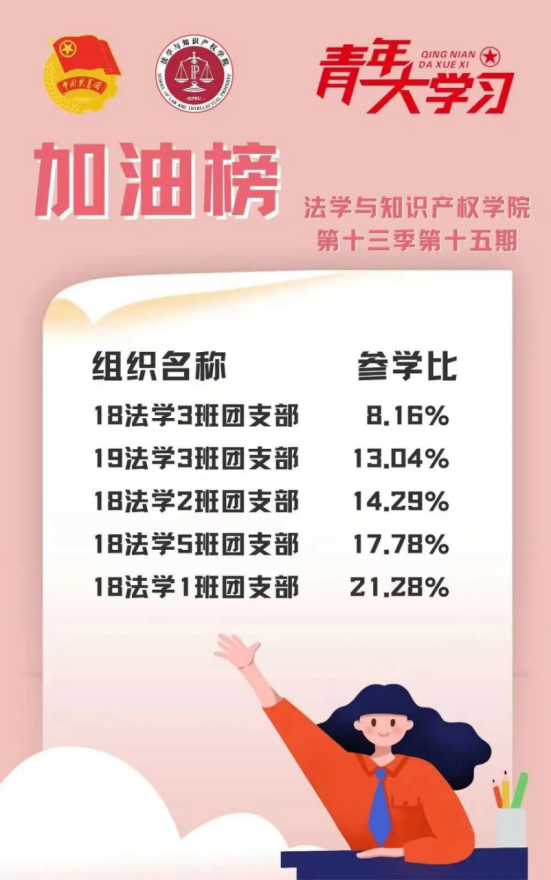 从各基层组织的课程学习情况来看,taptap点点体育21法学4班、3班、5班、6班和8班团支部的参学比均达100%及以上,成绩优异,是各团支部的学习榜样!此外,21法学3班、8班、20法学4班、18法学6班和7班团支部的参学积极性有所提高,希望再接再厉。最后,参学比较低的团支部仍需努力,向优秀榜样看齐,争取更好的成绩。