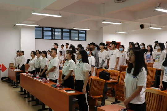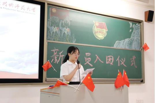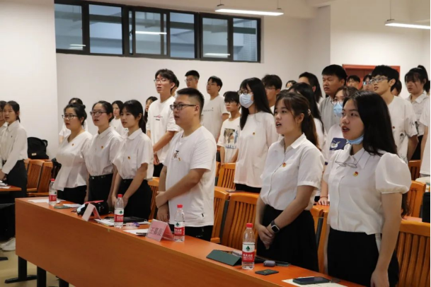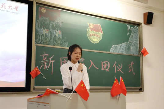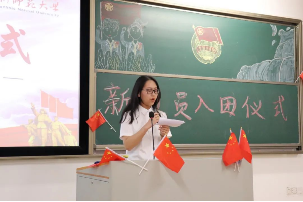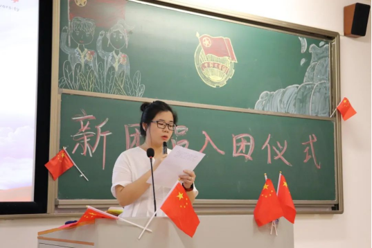 老团员杨雅舒作为领誓人,带领新团员进行宣誓,老团员重温入团誓词,提醒新老团员牢记誓言、担当责任、坚定信念,为共产主义事业而奋斗。