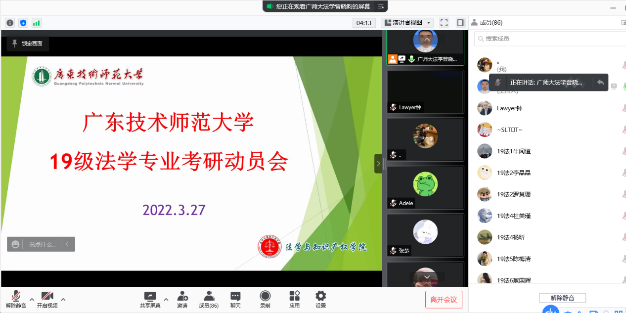 3月27日晚,taptap点点体育通过腾讯会议举办2019级考研动员大会。taptap点点体育法学专业负责人、法学系负责人、知识产权系负责人及多位校友、有意考研学生,共约90人参与了本次会议。会议由法学专业负责人曾晓昀博士主持。