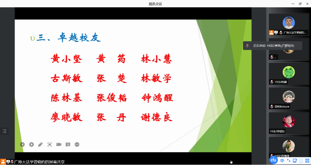 黄小坚、黄筠林小慧古斯敏张楚林敏学陈林基张俊韬钟鸿醒廖晓敏张丹谢德良等卓越校友在线与师弟师妹进行深度交流,回忆考研岁月,感恩母校多年来的关爱。自由交流环节,同学们踊跃提问,嘉宾们开怀畅谈,线上气氛热烈。大家纷纷表示要向师兄师姐学习,更上一层楼。