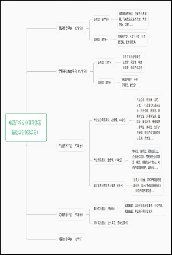知识产权专业(030102T)基本学制为四年,培养方案总学分为163学分,核心课程采取“1+10+X”分类设置模式,授予法学学士学位。在课程设置方面,除专业主干课程之外,突出应用类课程和法律职业技能实训课程,旨在培养学生具有扎实的知识产权法学知识储备、较强的法律应用能力和娴熟的法律职业技能;知识产权专业融合人文社科和自然科学知识元素,加强创新思维训练;知识产权专业主要为社会培养能系统掌握法学基础知识、具有较强的知识产权理论素养和实务操作能力的复合型人才。知识产权专业毕业生适合在国家立法机关、审判机关、检察机关、大型企业、律师事务所以及专利商标事务等知识产权中介服务机构中从事与知识产权相关的工作。