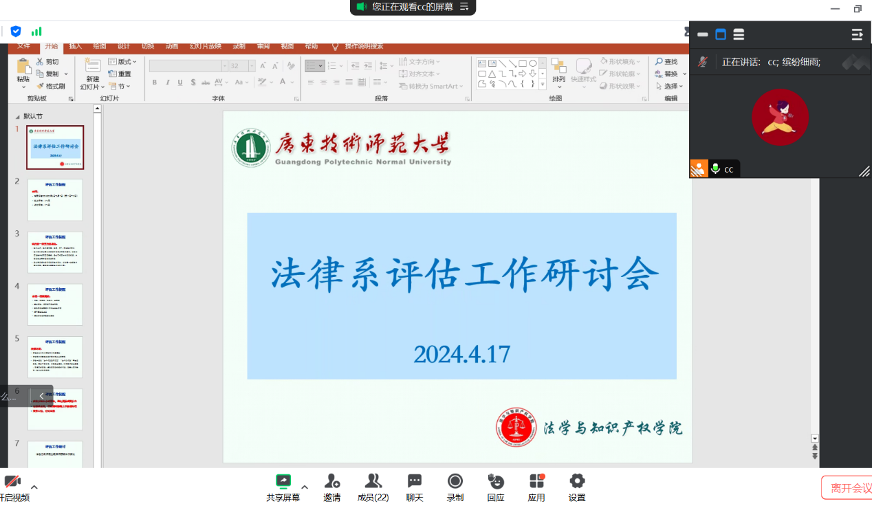 为准确传达本轮本科教育教学审核评估的工作要求,落实学校评估工作精神,进一步做好教学单位层面各项评估准备工作,强化教师的评估工作意识和职责认识,法律系于4月17日通过腾讯会议形式召开评估工作研讨会,法律系全体教师参会,会议由法律系主任万娟娟主持。